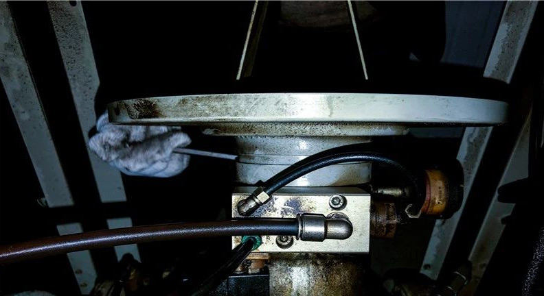 1. 过滤系统老化 目前空压机油滤芯和空气过滤器都出现不同成都的老化,这样会造成过滤系统阻力增大,大大增加了设备的运行功耗使得电费消耗急剧上升。如强行运行设备会对空压机过滤系统造成严重的破坏,如不及时更换老旧的过滤配件,内部的阻力过大产生高温容易点燃油气混合杂质极易发生爆炸十分危险 2.主机润滑剂氧化 空压机主机内超级冷却液出现较严重的氧化现象,空压机压缩室内润滑系统已失效。因客